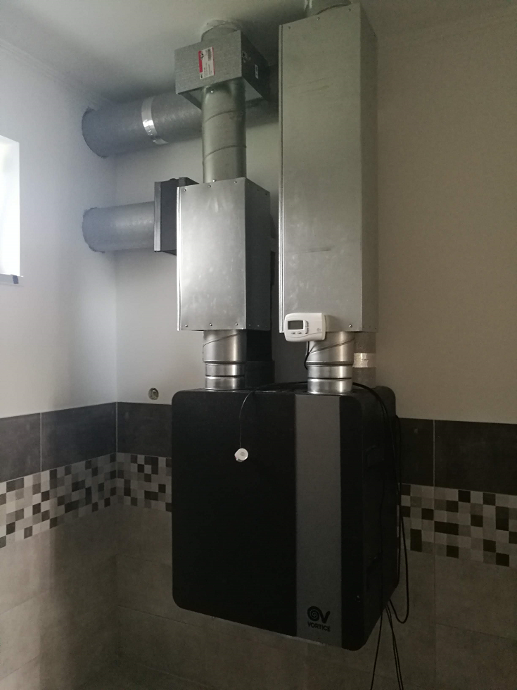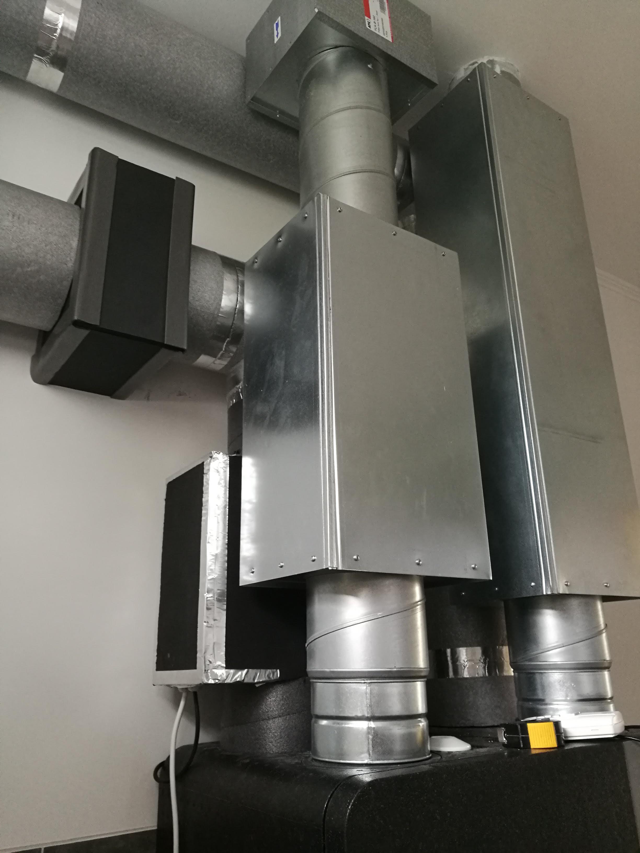 A gipszkartonok felrögzítése, festése, majd a háztartási helyiség festése, burkolása után a szellőztető gépet és tartozékait kellett az osztódobozok 160 mm-es csonkjaihoz "hozzáépíteni". Az "elülső" oldalon a befúvási oldal (1 méteres) és elszívási oldal (50 cm-es) ágakban a hangcsillapítók láthatóak, az elszívási oldalba egy szűrődoboz is került (a helyiségek felől érkező kosztól is érdemes védeni a hőcserélőt). Hátul pedig a friss levegőt szállító hőszigetelt cső, és az elhasznált levegőt "kidobó" cső látható. A friss levegő ágban szűrődoboz és fagymentesítő kalorifer is látható.