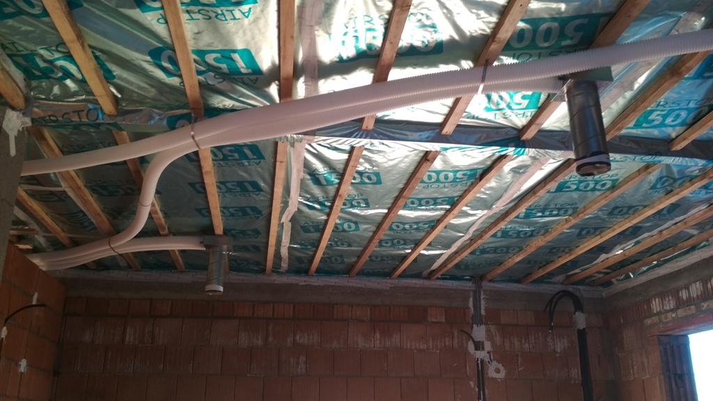 A Lindab LFPE flexibilis csőrendszere, a PVCU csatlakozó dobozok és MCU osztódobozok az álmennyezetben kaptak helyet, szerelésük az álmennyezet profilszerkezet felrakása előtt történt, a fa födémszerkezethez rögzítve. A csatlakozó dobozok csonkjai gumis toldóval és méretre vágott spirál korcolt csővel lettek meghosszabbítva, hogy "leérjenek" a jövőbeni plafonsíkig. A 2 db 200 mm átmérőjű külső fali áttörés is elkészült, a 160 mm-es hőszigetelt (20 mm falvastagságú) csövek ezen át fognak a külvilágba jutni.