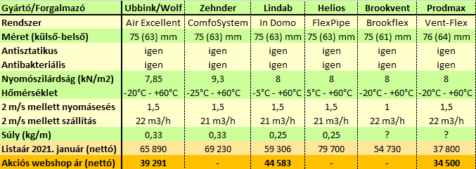 - Látható, hogy a 6 db felsorolt légtechnikai cső szinte minden tulajdonságban azonos vagy nagyon hasonló. Legnagyobb eltérés a színükben van, ami viccesen hangzik, de van némi valóságalapja. Talán jelentős eltérés még a súlyuk, hiszen a 0,25 kg/m és a 0,33 kg/m 30%-os súlyeltérést jelent, ennek a pontos oka jó kérdés; valóban kicsit sűrűbb anyagúnak tűnik (és egyértelműen nehezebb) az Ubbink és a Zehnder cső tekercse a többinél.