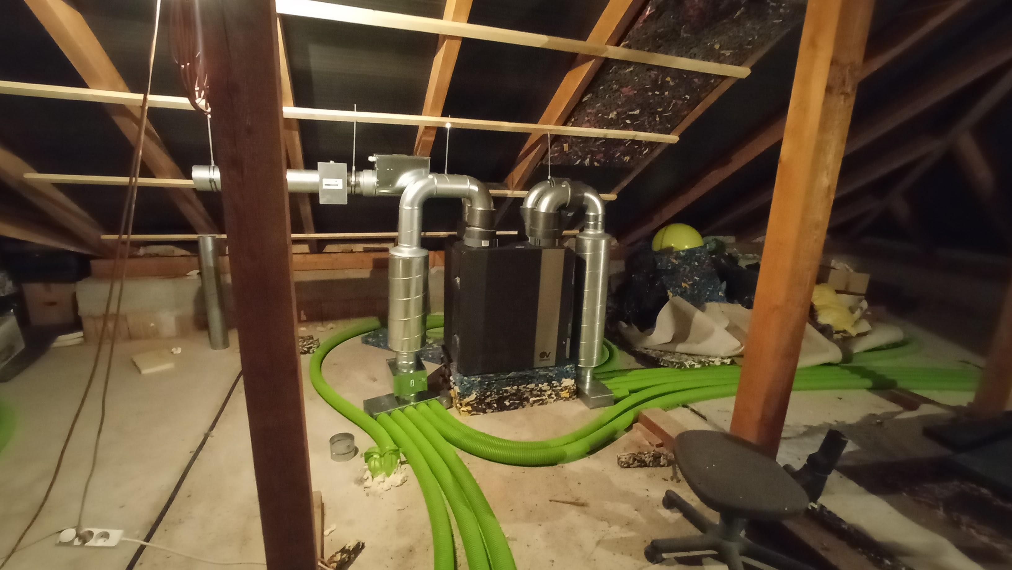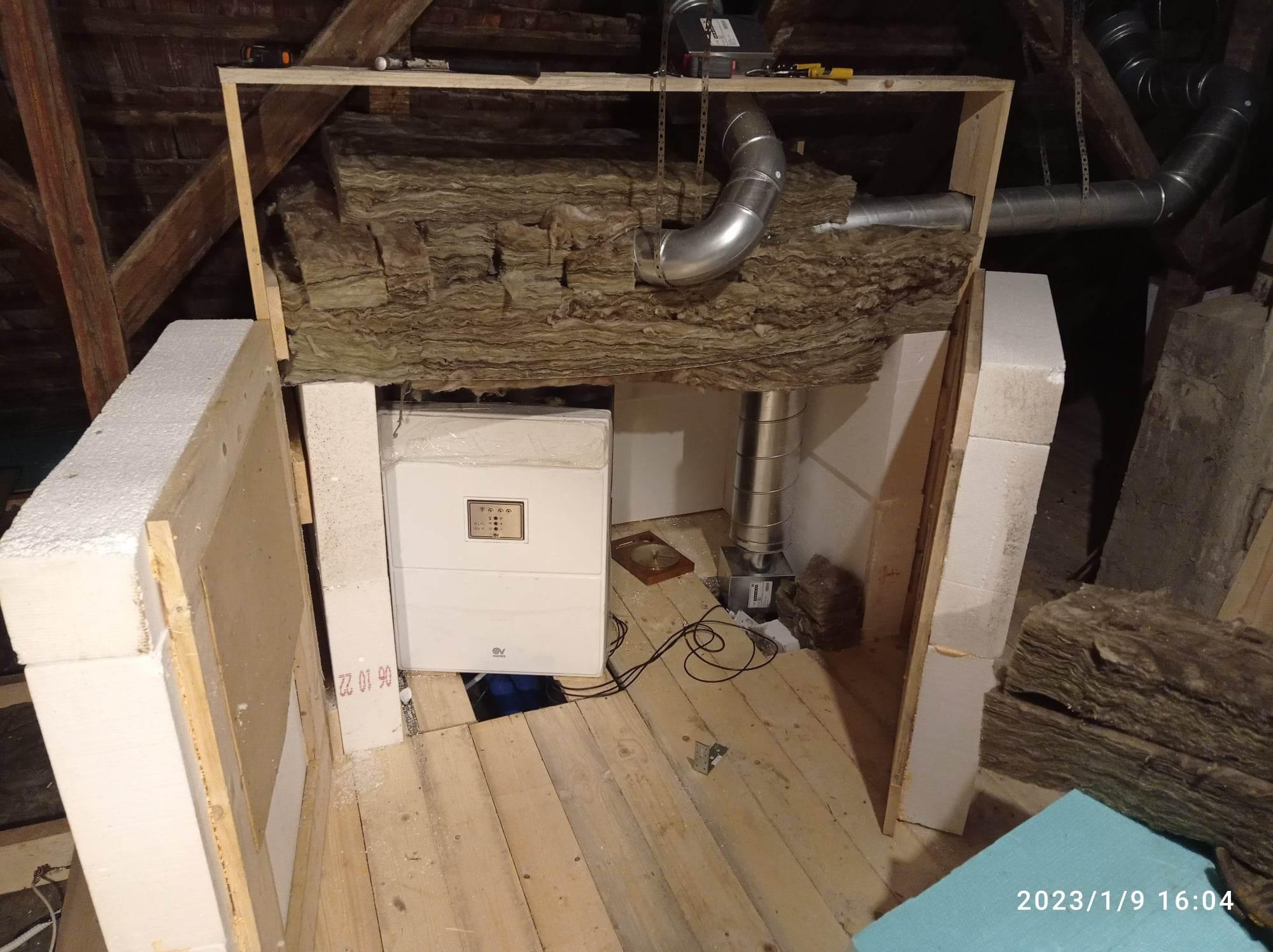 Amennyiben padlásra került a hővisszanyerős szellőztető rendszer, arra kell figyelni, hogy a flexibilis csövek lehetőleg közvetlenül a meleg födémre kerüljenek, és föléjük kerüljön a hőszigetelés. A szellőztető gép pedig meleg burkot kapjon. Egy szép megvalósításról külön bejegyzést is írtunk. Néhány kép ilyen helyzetről: