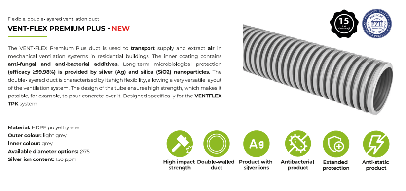 A Prodmax Vent-Flex Prémium Plus légtechnikai cső hővisszanyerős szellőztető rendszerek befúvására és elszívására alkalmas termék. A flexibilis cső kétrétegű, külső rétege mechanikai védelmet ad (betonozható termék), belső rétege antibakteriális és gombaölő tulajdonságokkal rendelkezik. Az ezüst (Ag) és szilícium (SiO2) adaléknak köszönhetően hosszútávú mikrobiológiai védelem jellemzi, továbbá antisztatikus.