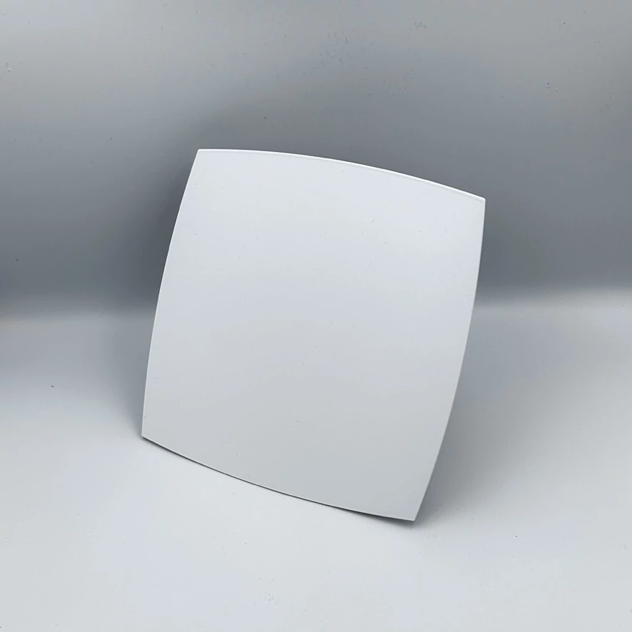 Elegáns megjelenésű, lekerekített négyzet frontlappal és kör alakú szeleptesttel rendelkező fém design légszelep, amely hófehér színével, síkba illeszkedő testével és frontlapjával belesimul a mennyezetbe.