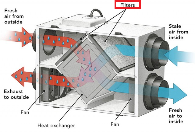 A központi szellőztető gépekben jellemzően helyet kap 2 db szűrő is; az egyik a külvilágból friss levegőt beszívó ágba, a másik pedig a helyiségek felől elhasznált levegőt elszívó ágba. Mindkét irányból a szellőztető gépben található hőcserélő "elé" kerül a szűrő, védve azt az elkoszolódástól.